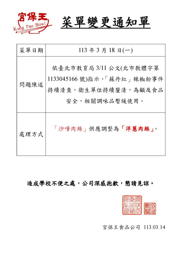 113年3月18日變更菜單通知